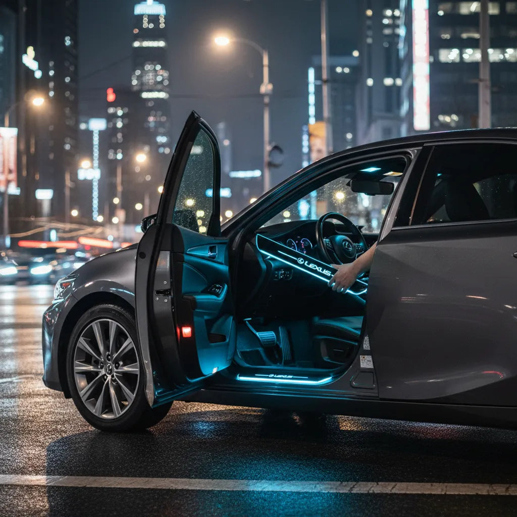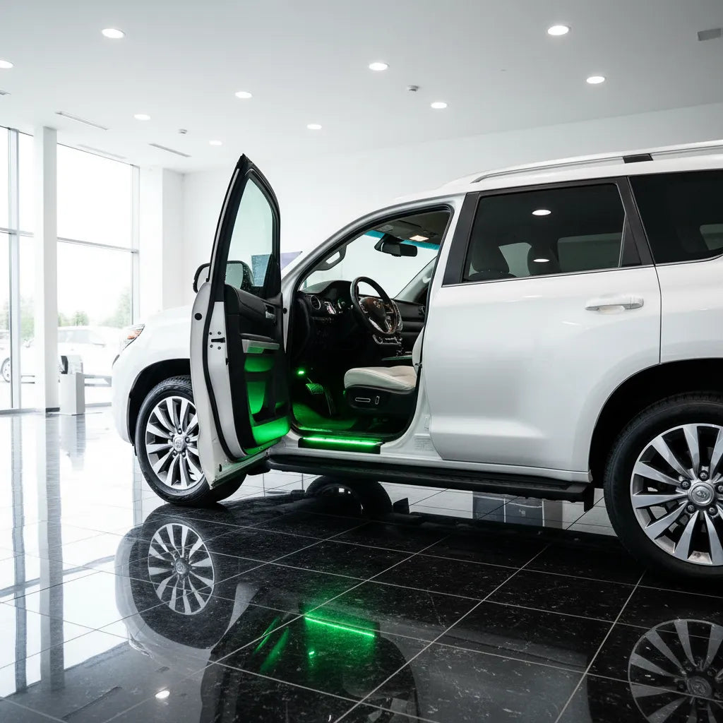 When you open the door, the door sill pan automatically lights up and displays the vehicle’s name and logo. They turn off as the door is closed. The LED door sills’ light is even and soft, making the car more futuristic and gorgeous.